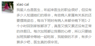 @xiao cai :我爱人也是医生,听起来医生的职业很好,但没有多少人知道她们的艰辛,有些病人家属有关系的还要摆高姿态,每当下班时有病人来都会晚下班1-2个小时回到家饭都凉了,真是又饿又累还没有正常的休假日。每次加班都让我看的心疼,所以只要她加班我都会等她一起吃饭,我能做的不多,有多少算多少吧,医生真的很辛苦。