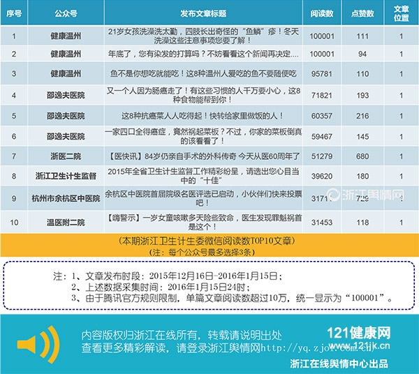据浙江在线舆情中心监测数据显示,2015年12月16日-2016年1月15日期间,参与排行的174个浙江卫生计生委系统政务微信公众号,小编们累计发文3715篇,累计获得8469762次阅读,点赞数50603次(上期三者相应数据分别为3752、8724673、51581)。从具体排名看,在TOP10榜单中,前四名与上期保持一致,依然为“健康温州”、“邵逸夫医院”、“温医附二院”、“东阳市人民医院”。值得注意的是,本期TOP10中又迎来了新面孔,“杭州市第一人民医院”首次冲进TOP10,位列第九名。上期的新面孔“浙医二院”,本期位列第五名,较上期上升3个名次。