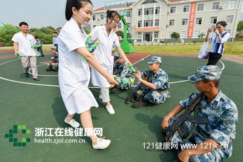 今年是中国人民解放军建军90周年,在八一建军节来临之际,医务工作者不仅为训练场上的官兵送上解暑饮品,同时还在现场开展义诊,提供骨科、皮肤科、中医理疗等方面的服务。