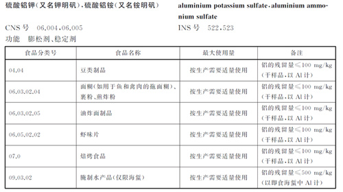 记者查阅了《食品安全国家标准食品添加剂使用标准》,标准显示,自去年7月1日起,我国允许使用的含铝食品添加剂只有硫酸铝钾和硫酸铝铵两种,且除了豆类制品、煎炸粉(面糊、裹粉)、油炸面制品、虾味片、焙烤食品、腌渍海蜇6类食品外,其余所有食品均不允许使用。