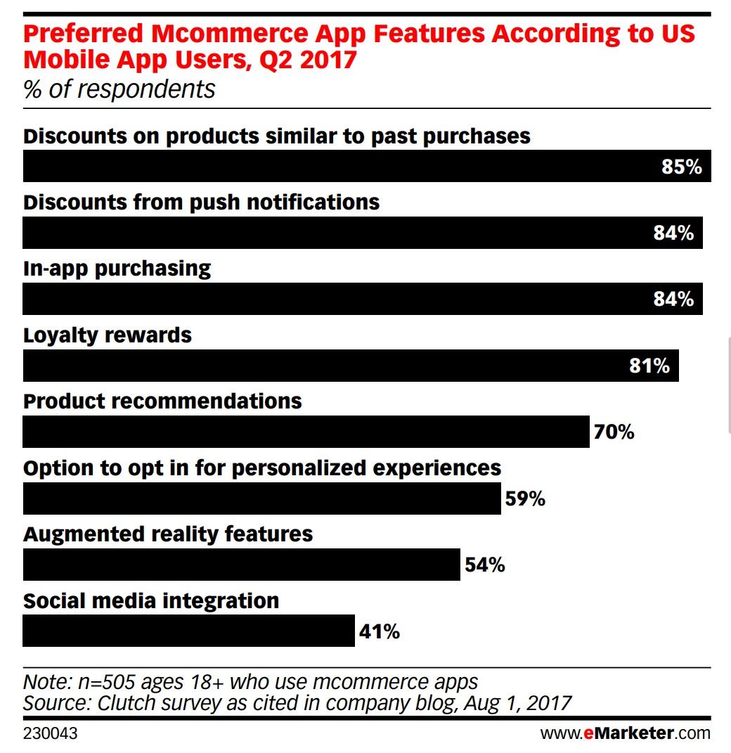 和中国消费者一样,美国电商消费者也喜欢折扣,对电商App最认可的几个特性排名中“买过的商品折扣”以及“推送的商品折扣”是最受欢迎的两个功能,而亚马逊引以为豪的商品推荐功能在消费者心中的排名并不靠前。