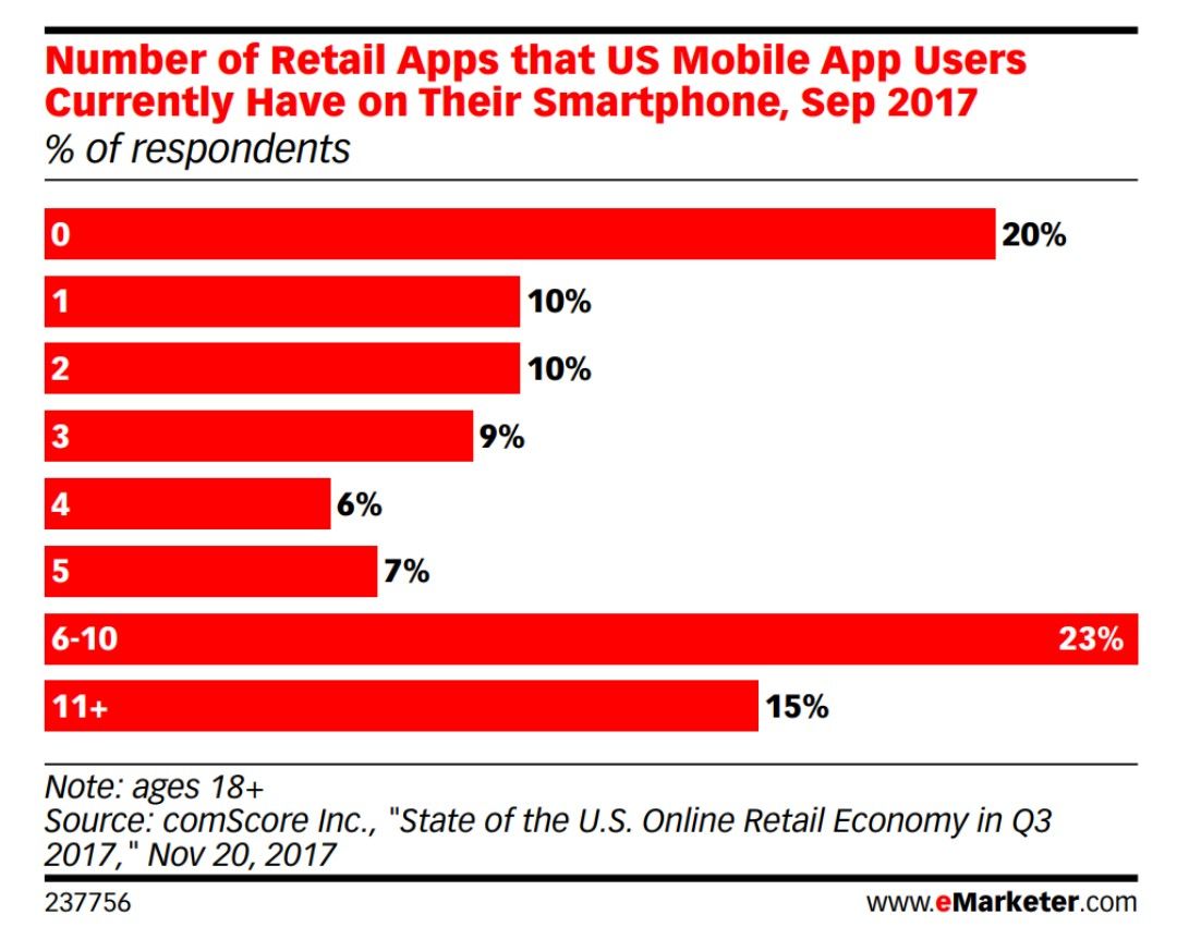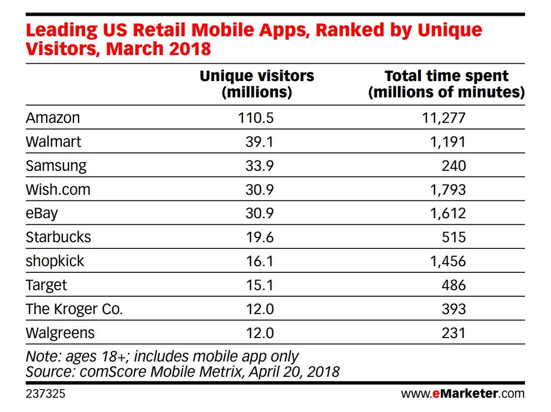 因而对于那些长尾的APP而言,需要从亚马逊、沃尔玛等头部APP中赢得用户的青睐具有极大的挑战,排名第十的Walgreens 只有1200万独立用户了,这意味着那些十名开外的长尾APP需要争夺更加有限的用户群体。