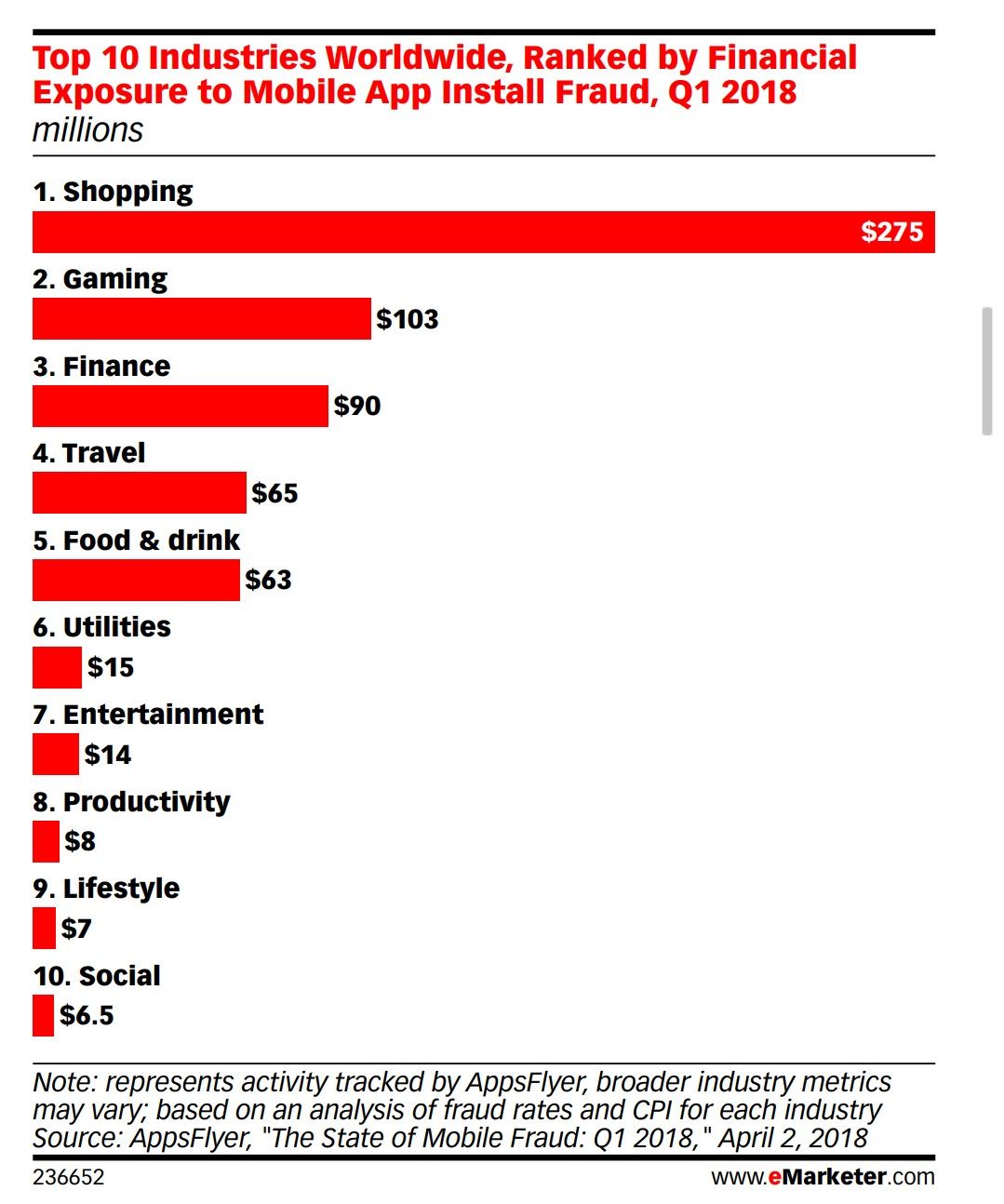 一种可能的解释是购物类APP离钱最近,在推广预算花费上比较充足,单次安装得到的回报也相对较高,于是成了APP欺诈安装的重灾区。