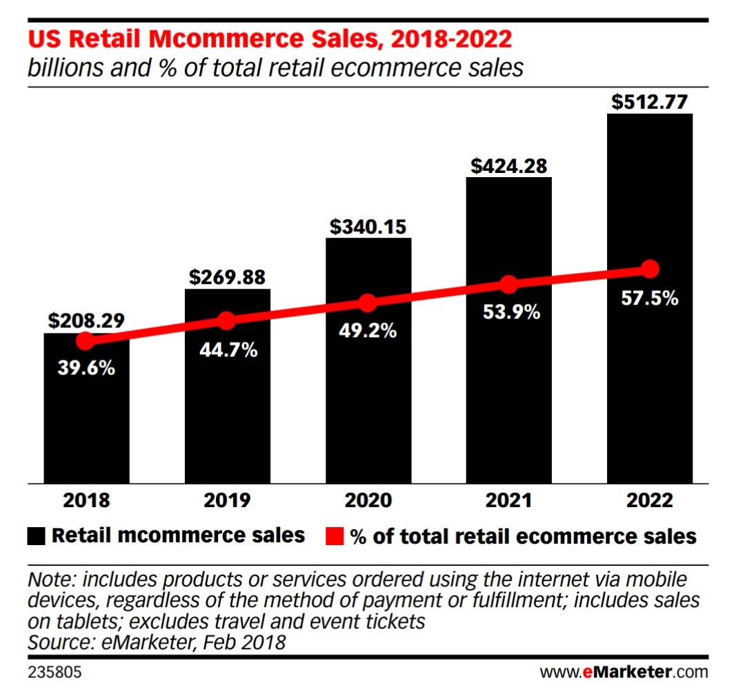 eMarketer的报告显示,移动电商在总电商的比例在2018年为39.6%,占比居然没有过半,也就是说有超过一大半的美国人网上购物都是在电脑前完成的,而非手机端,尽管这一比例在迅速上升,但eMarketer预计,即便到2022年,这一比例也仅为57.5%。