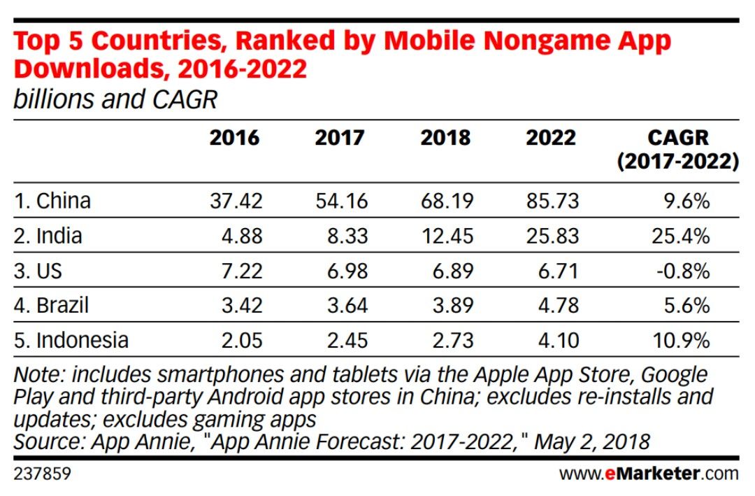 让人意想不到的是——在移动互联网极其发达的美国,其应用下载总量的在持续下降,而中国印度这样的新兴国家应用下载总量依然在不断增长,特别是印度,年对年增速亮眼,这也是很多中国公司出海的时候选择印度的一个重要原因——增长对创业者而言就是命。