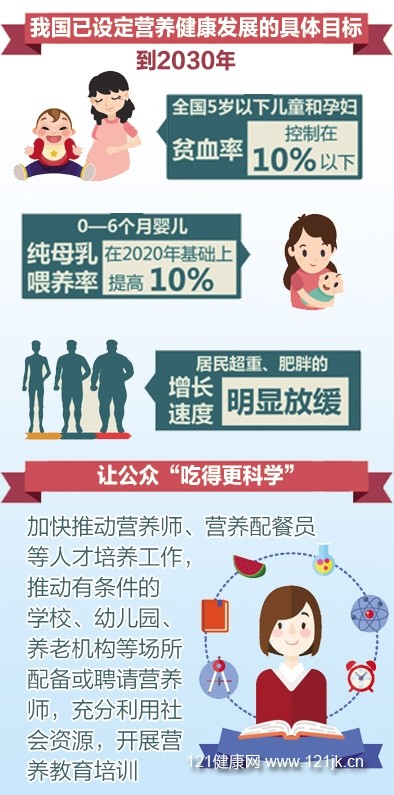 “各项措施综合施策,目的是使我国营养工作体系更加完善,居民营养健康状况显著改善。”国家卫计委副主任金小桃说,我国已设定营养健康发展的具体目标,到2030年,全国5岁以下儿童和孕妇贫血率控制在10%以下,0至6个月婴儿纯母乳喂养率在2020年基础上提高10%,居民超重、肥胖的增长速度明显放缓,等等。