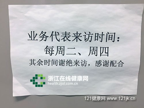 浙江省人民医院院区的东北角,是医院的药库,在这个鲜有人走的地方,入口处十分明显地贴着告示:“加强医疗卫生行风建设‘九不准’”,“业务代表来访时间:每周二、周四其余时间谢绝来访,感谢配合”。