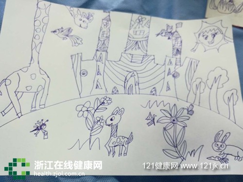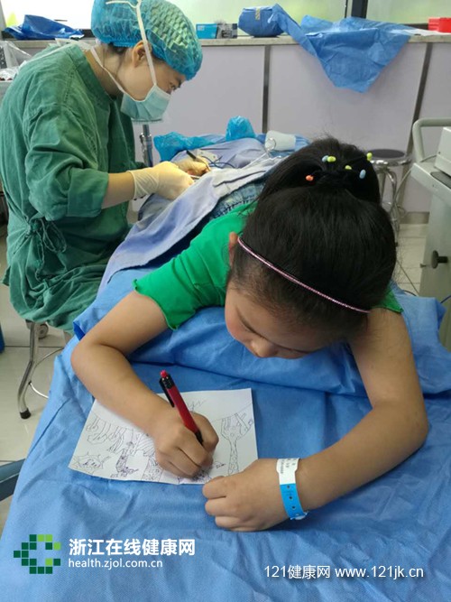 今天已经是小美第三次手术了,因为孩子进入陌生的手术室都会有些害怕,所以手术室的护士有时就会用手套给孩子吹个气球玩,或者一起在上面画画。今天,王慧医生看到小美有些紧张,就在医生给打麻醉时准备给她画点什么分散注意力。结果平时素爱画画的小美跟着一起画,就入了迷。
