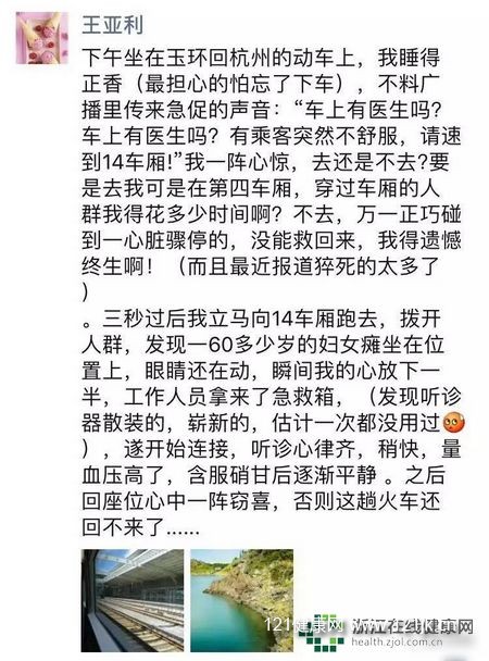 “太谢谢您了,这次多亏了有好心人!”当列车停驻在杭州东站后,被救助者家属激动地连连鞠躬,握着“救命恩人”的手道谢。这名医务人员不是别人,正是浙江医院门诊部副主任、心血管内科王亚利副主任医师。