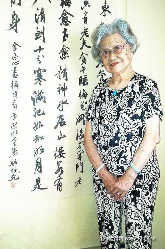 90岁那年的章洁明。她喜欢书法和文学,房间里挂满了自己的笔墨(照片由家属提供)