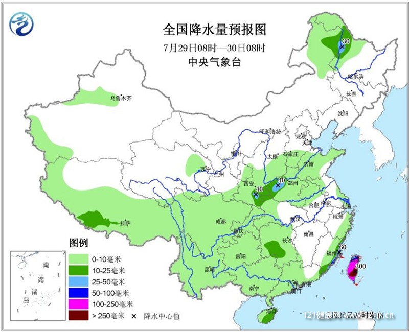 29日08时至30日08时,福建东部等地有较强降雨。陕西南部、河南西部、福建东部、台湾、广东东部、黑龙江西部等地有中到大雨,福建东部、台湾的部分地区有暴雨,台湾局地有大暴雨到特大暴雨(250~300毫米);上述部分地区有短时强降水,局地伴有雷暴大风等强对流天气。