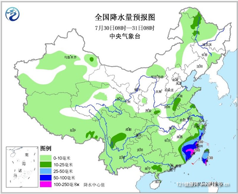 30日08时至31日08时,华南东部江南东部有强降雨。华南东部和南部、江南东部、黄淮、四川南部、台湾等地有中到大雨,浙江东南部、福建大部、广东东部、台湾等地的部分地区有暴雨,福建东部、台湾局地有大暴雨(100~200毫米);上述部分地区有短时强降水,局地伴有雷暴大风等强对流天气。