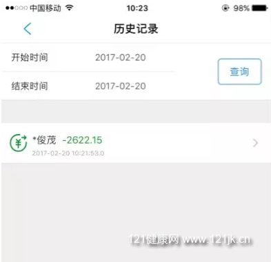 点击查看历史记录页面,通过选择时间段进行查询历史转账记录(如图2-2-1),点击历史记录中的某一条查看详细信息(如图2-2-2)。