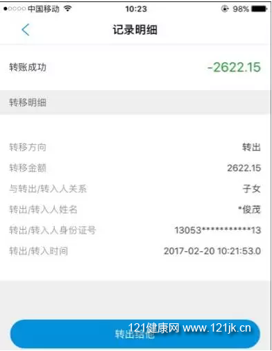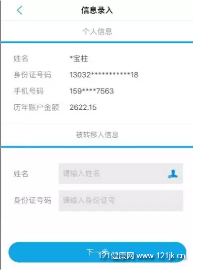 点击家庭账户转账进入信息录入页面(如图2-1-1),个人信息为自动获取,并因保密隐藏用户部分信息,输入被转移人信息,包含被转移人的姓名和身份证号码(亦可通过转账历史记录中选择被转移人信息(如图2-1-2)),点击下一步按钮进入转移录入(如图),填写被转移人与本人关系和转移金额等信息,输入验证码点击提交则完成转移操作(如图2-1-3)。