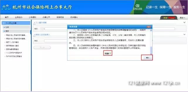 第三步:进入模块后,页面提示免责条款,参保人员需要阅读免责条款并在文本最下方选择“同意”选项,再点击“确认”按钮;