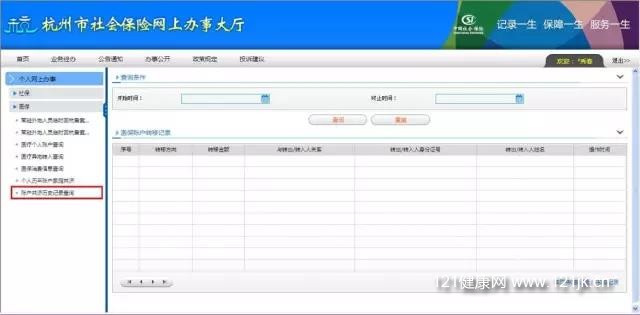 第三步:输入开始时间、终止时间,点击查询。医保账户转移记录列表中显示本人的账户转移记录。