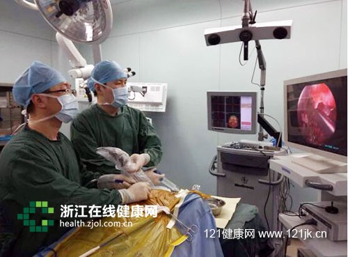 浙医二院神经外科洪远(左)副主任医师正在手术