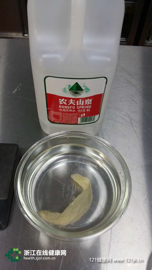 首先,将燕窝浸泡在矿泉水里一小时,撕碎,过滤冲洗。
