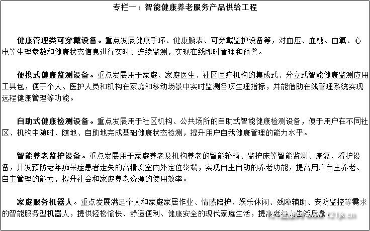 丰富智能健康养老服务产品供给。针对家庭、社区、机构等不同应用环境,发展健康管理类可穿戴设备、便携式健康监测设备、自助式健康检测设备、智能养老监护设备、家庭服务机器人等,满足多样化、个性化健康养老需求。