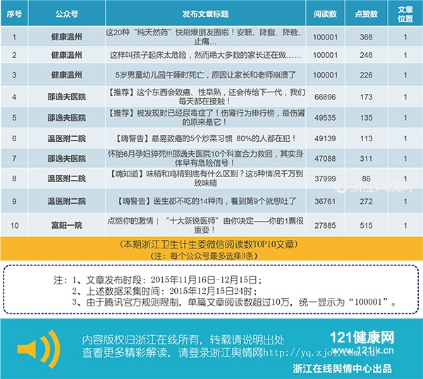 浙江卫生计生委系统微信排行榜(11月16日-12月15日)
