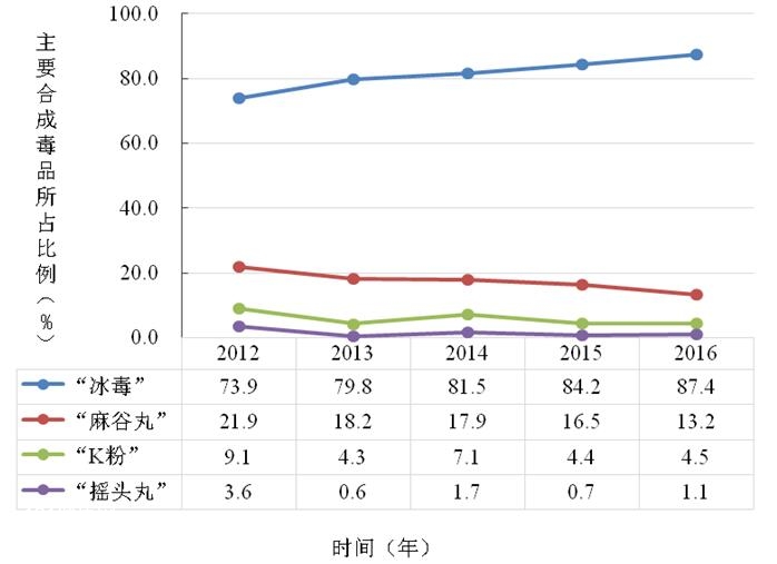 图12 2012年—2016年主要合成毒品在合成毒品滥用人群中所占比例