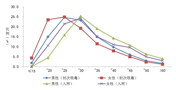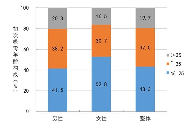 初始滥用年龄:合成毒品滥用人群初次平均药物滥用年龄为28.3±8.6岁,男性为28.6±8.6岁,女性为26.6±8.7岁。其中35岁以下青少年远高于整体药物滥用人群,43.3%的合成毒品滥用者开始滥用毒品年龄小于25岁。