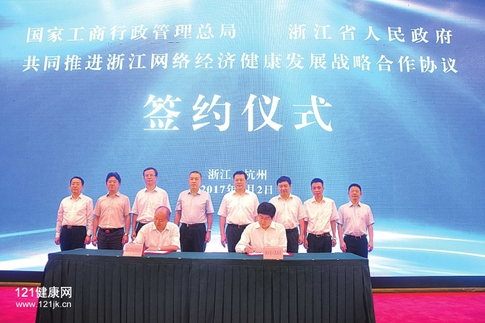 为促进“大众创业、万众创新”,进一步落实国务院深化“放管服”改革要求,9月2日上午,国家工商总局与浙江省政府在杭州签署《关于共同推进浙江网络经济健康发展战略合作协议》。国家工商总局局长张茅、浙江省省长袁家军出席签约仪式。总局副局长王江平和浙江省副省长朱从玖分别代表国家工商总局、浙江省政府签署部省战略合作协议。