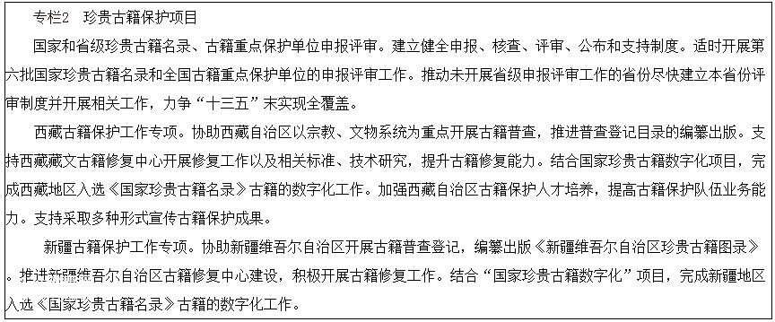 2.加强珍贵古籍保护。继续开展国家和省级珍贵古籍名录及古籍重点保护单位的申报评审,重点做好少数民族文字珍贵古籍申报评审工作。根据《图书馆古籍书库基本要求》,做好各级古籍收藏机构的库房新建和改扩建工作。对国家珍贵古籍实施专库或专架管理,确保珍贵古籍实体安全。各地古籍保护机构根据实际做好珍贵古籍装具配置工作。推进国家图书馆国家文献战略储备库建设。推动建设一批符合国家标准的古籍寄存书库,为不具备存藏条件的单位提供寄存服务。建立国家古籍数字资源异地镜像保存体系。鼓励有条件的地方推进古籍异地异质灾备工作。继续实施新疆、西藏及四省藏区的古籍保护工作专项,加大对新疆、西藏及四省藏区宗教活动场所古籍保护经费投入。