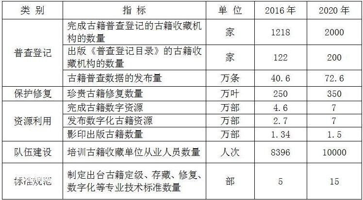 到2020年,全国古籍资源和保存状况基本摸清,国家级、省级珍贵古籍保护状况明显改善,实施一批珍贵古籍修复项目,完成一批在全国有重大影响的古籍影印出版工作,珍贵古籍缩微复制和数字化成果显著,古籍公共文化服务功能和社会教育的作用更加彰显,古籍保护人才队伍结构不断优化、专业水平明显提升,制度建设、立法工作和标准规范有较大进展,社会参与的广度和深度不断拓展,古籍传承文明、服务社会的能力进一步提升。