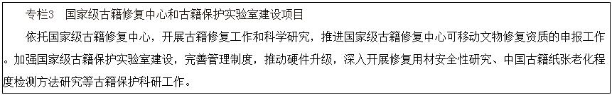 3.加强古籍保护技术研究。推进古籍保护机构和存藏单位与其他公共文化单位、高等院校、科研院所、中等职业学校、高科技企业等领域的深度合作,开展古籍修复的理论和技术研究。借鉴国外先进修复技术,创新我国古籍修复的工艺和方法。在具备条件的图书馆设立高水平文献保护重点实验室,开展古籍保护技术的研究和实验。