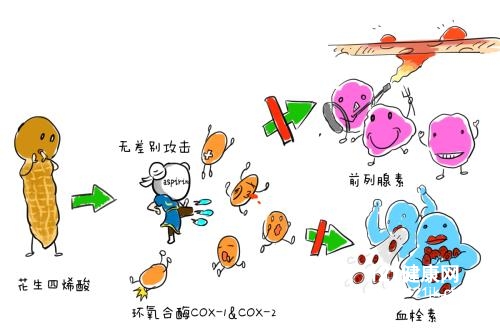 阿司匹林运作原理:花生四烯酸经由环氧酶途径后,经由其他酶生成前列腺素类化合物及血栓素类化合物,前者诱发炎症,后者使血小板聚集,阿司匹林则使环氧酶失活,使后两种化合物合成受阻。