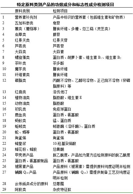 10. 保健食品应具有与产品配方和申报的保健功能相适应的功效成分或标志性成分,申报时须提供配方中主要原料所含的功效成分或标志性成分的检测结果、检方法及方法学验证结果。第六部分列出了原料类型及相应检测项目,以所列原料为主的产品须检测表中规定的项目。