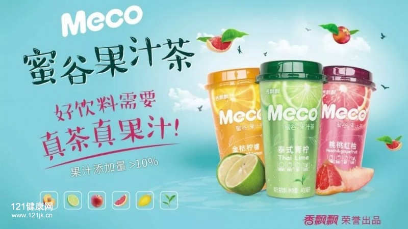 香飘飘抓住茶饮崛起的第一趟顺风车后,在新式茶饮上继续发力,推出Meco蜜谷·果汁茶,定位于“真茶真果汁”,新鲜茶叶萃取,真实果汁添加,并且以茶饮密封杯形式包装,让消费者随时随地享受新鲜美味。