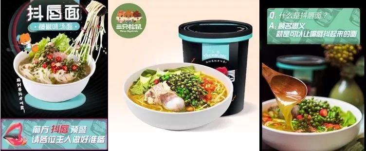 抖音作为最火热的短视频平台,三只松鼠抓住抖音流量,专门设计、玩法都颇具抖音风格的非油炸泡面产品——抖面。在“抖”字上深挖,主打的口味是麻+辣的口味,增加“进阶版挑战口味包”,辣到嘴唇发抖;采用了“黑、粉、蓝”的搭配,配合着网络上专属的15秒“魔性抖面舞”,“抖音风”十足。