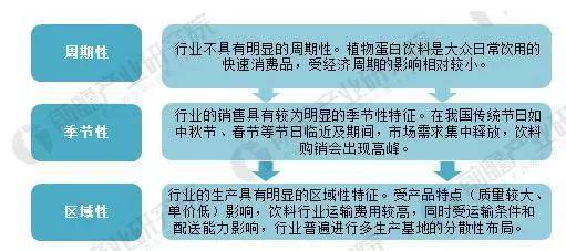 植物蛋白饮料行业上游依赖富含蛋白质的大豆、花生、杏仁等农产品,下游依赖消费者的消费需求,所以行业的发展主要受上下游行业发展特征而影响。植物蛋白饮料受上游农产品生产的季节性特征的影响,但是现阶段农产品储藏能力的提升,该种季节性的影响不明显,行业的季节性主要受国内节假日等的影响,在国内传统节日及文化习俗的影响下,会促进消费者对饮料的消费需求。在人们更注重营养保健的背景影响下,会促进植物蛋白饮料的产品需求。