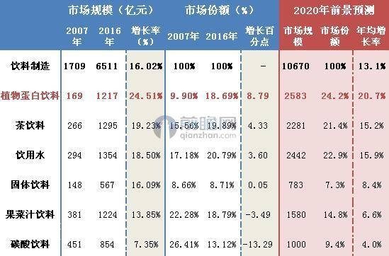 前瞻产业研究院分析认为,随着碳酸饮料及含乳饮料行业面临产品品种老化、渠道表现力弱、消费群体单一、安全问题频发等瓶颈的拖累,饮料市场继续向植物蛋白饮料、茶饮料、饮用水等“健康”饮料方向发展,植物蛋白饮料行业未来几年的增速将有望保持在20%以上,领跑整个饮料制造市场,预计到2020年植物蛋白饮料市场规模达2583亿元,占饮料行业的比重继续上升至24.2%。