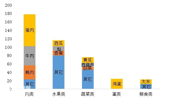从产品分类看,受理量排名前五的是肉类、水果类、蔬菜类、蛋类、粮食类。肉类产品举报集中在猪肉、牛肉、鸭肉等定价问题方面;水果类价格举报中,反映西瓜、梨、苹果等多种水果定价高、明码标价不规范等问题比重较高;蔬菜类价格举报,主要反映明码标价不规范,黄瓜、西葫芦等蔬菜不同地区价格差大等问题。